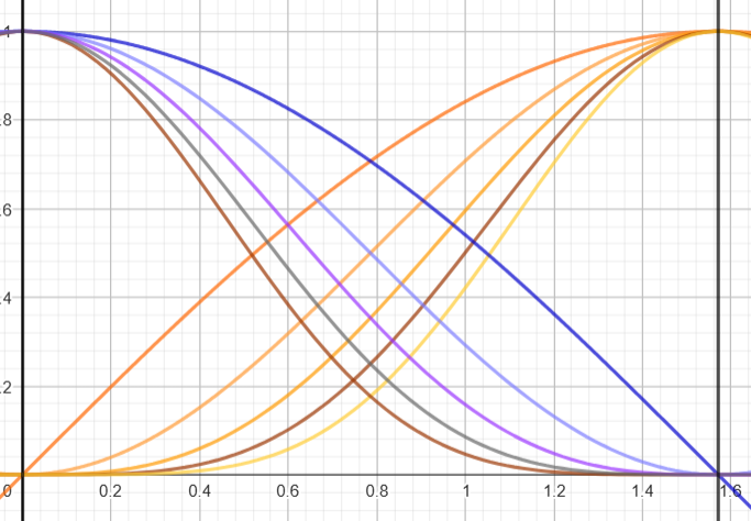 On peut essayer de tracer les fonctions \(sin^nt\) et \(cos^nt\) pour différentes valeurs de \(n\)