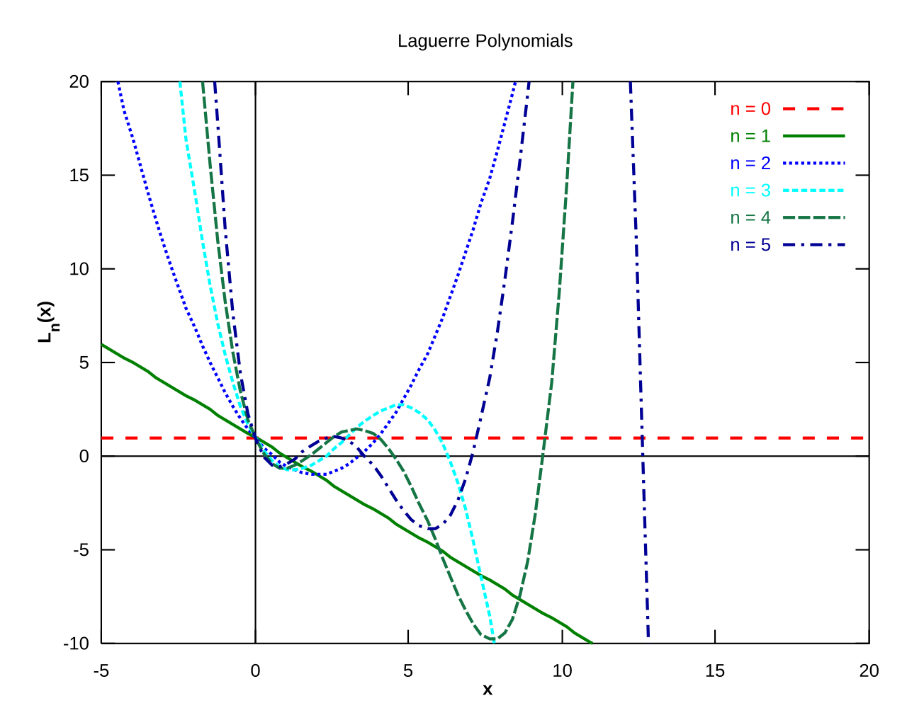 \[\begin{align*} L_n(x) = \frac{e^x}{n!}(x^n e^{-x} )^{ (n) }\end{align*}\] \(\begin{align*} L_0(x) = \frac{e^x}{0!}(x^0 e^{-x} )^{ (0) } = e^x(1 \times e^{-x} )^{ (0) }=e^x \times e^{-x}=e^0 = 1\end{align*}\) \(\begin{align*} L_1(x) & = \frac{e^x}{1!}(x^1 e^{-x} )^{ (1) } = e^x(xe^{-x})' = e^x[e^{-x}-xe^{-x} ] \\ \(\begin{align*} L_2(x) & = \frac{e^x}{2!}(x^2 e^{-x} )^{ (2) } = \frac{e^x}{2}(x^2 e^{-x} )" = \frac{e^x}{2} \times [2x e^{-x}-x^2e^{-x}]' \\